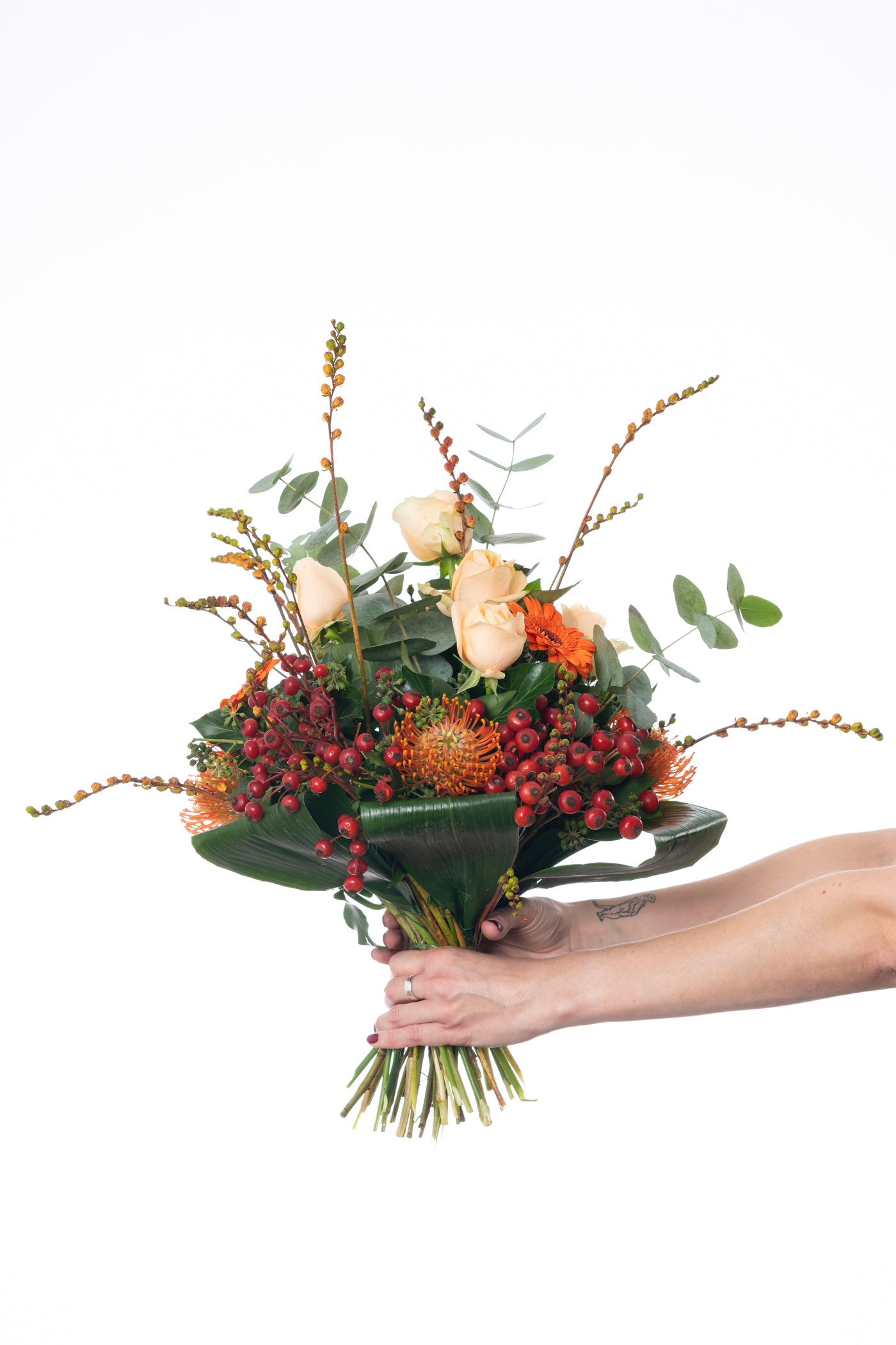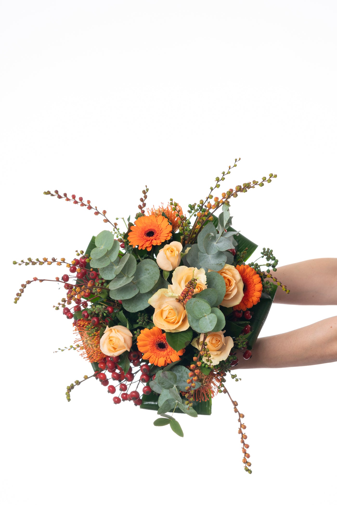 Der "Goldene Wärme" begeistert mit seiner lebendigen Kombination aus warmen Orange- und Gelbtönen. Strahlende Gerbera und zarte Rosen werden durch Beeren und exotische Blüten ergänzt, eingerahmt von frischem Eukalyptusgrün. Dieses harmonische Arrangement bringt die Wärme sonniger Tage in Ihr Zuhause und eignet sich perfekt als Geschenk oder dekorativer Blickfang.